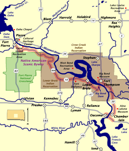 If you are looking for a route through central South Dakota that keeps you close to the Missouri River, includes historic points of interest, and provides beautiful scenery; may we suggest the Native American Scenic Byway from Chamberlain to Fort Pierre?