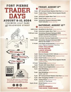 6th Annual Trader Days Date Aug 09 - 10 2024 Expired! Time All Day Location Fischers Lilly Park 414 Ash Avenue, Fort Pierre, SD Share this event