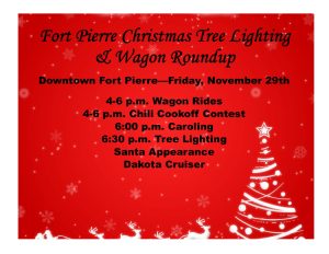 Fort Pierre Annual Christmas Tree Lighting & Wagon Roundup Cookoff Wagons Ho! Date Nov 29 2024 Expired! Time 4:00 pm - 7:00 pm Location Pat Duffy Center 19 E Main Ave, Fort Pierre, SD 57532 Share this event