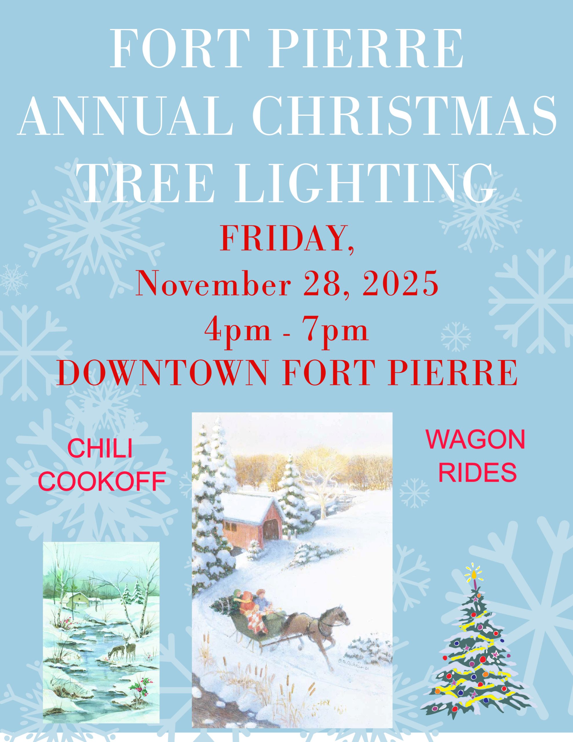 Fort Pierre Annual Christmas Tree Lighting Date Nov 28 2025 Expired! Time 4:00 pm - 7:00 pm Location Pat Duffy Center 19 E Main Ave, Fort Pierre, SD 57532 Share this event