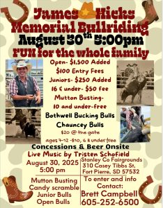 James Hicks Memorial Bullriding Date Aug 30 2025 Expired! Time 5:00 pm - 8:00 pm Location Stanley County Fairgrounds 310 Casey Tibbs Street, Fort Pierre, SD Share this event