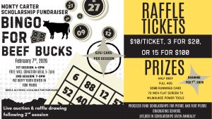 Monty Carter Scholarship Fundraiser BINGO FOR BEEF BUCKS! FREE WILL DONATION MEAL 5-7 PM Live Auction & Raffle Drawing Following 2nd Session Date Feb 07 2026 Expired! Time 4:00 pm - 9:00 pm Location Duffy Community Center 19 East Main Avenue, Fort Pierre, SD Share this event