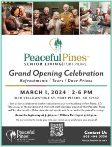 Peaceful Pines at Fort Pierre Grand Opening/Ribbon Cutting Date Mar 01 2024 Expired! Time 2:00 pm - 6:00 pm Location Peaceful Pines Senior Living 1000 Yellowstone Street Share this event