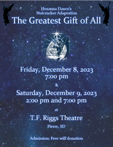 The Greatest Gift of All: Nutcracker Hourly Schedule Friday, December 8th 7:00 PM Saturday, December 9th 2:00 PM First showing 7:00 PM Second showing Date Dec 09 - 10 2023 Expired! Location Riggs Theater 1010 East Broadway Avenue, Pierre, SD Share this event