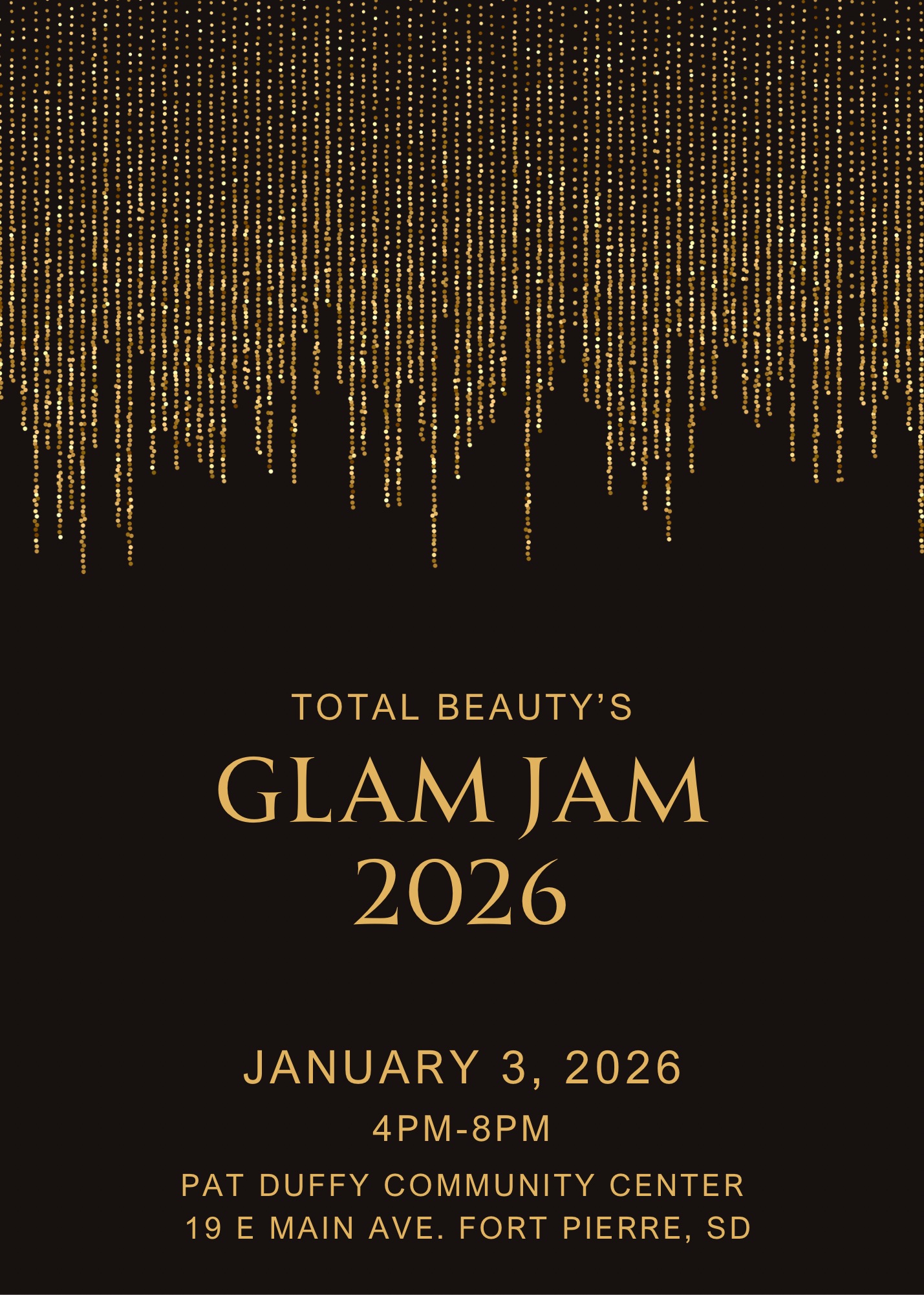 Total Beauty’s Glam Jam Date Jan 03 2026 Expired! Time 4:00 pm - 8:00 pm Location Duffy Community Center 19 East Main Avenue, Fort Pierre, SD Share this event