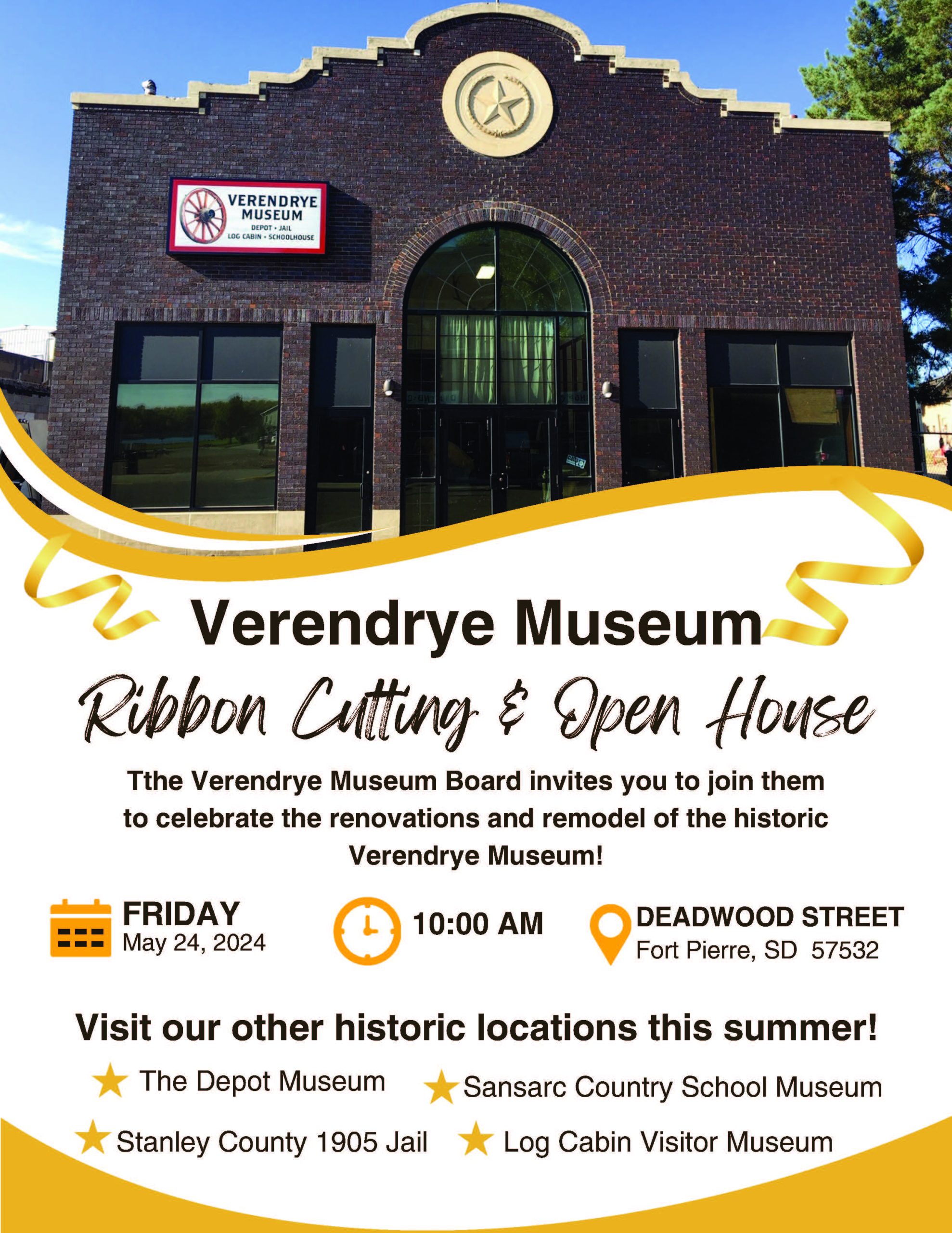 Verendrye Museum Ribbon Cutting & Open House Date May 24 2024 Expired! Time 10:00 am - 11:00 pm Location Verendrye Museum 115 Deadwood Street Fort Pierre SD Phone 605-223-7761 Share this event