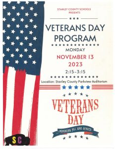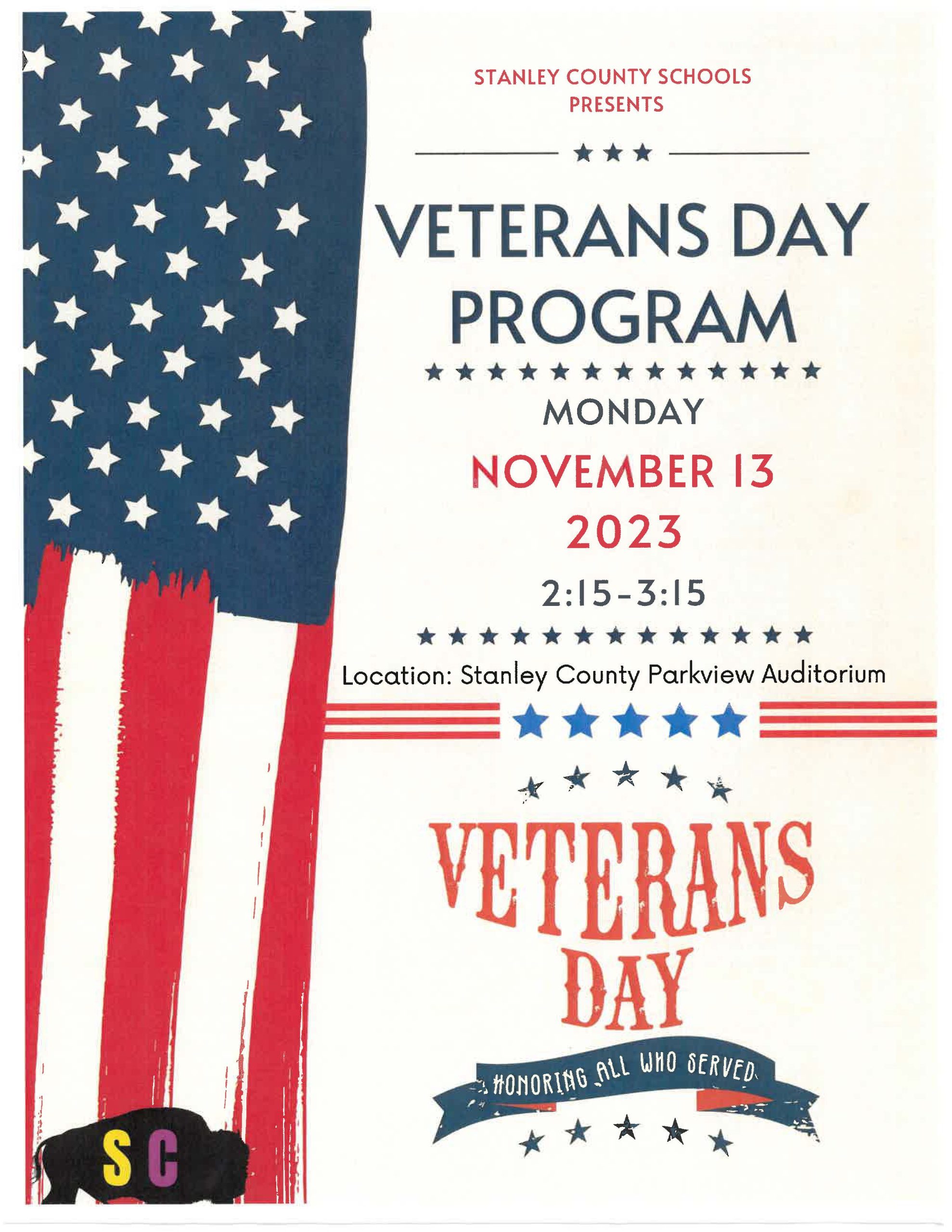 Veterans Day Program Date Nov 13 2023 Expired! Time 2:15 pm - 3:15 pm Location Stanley County HS Parkview Gym 10 E Main Avenue Fort Pierre SD Share this event
